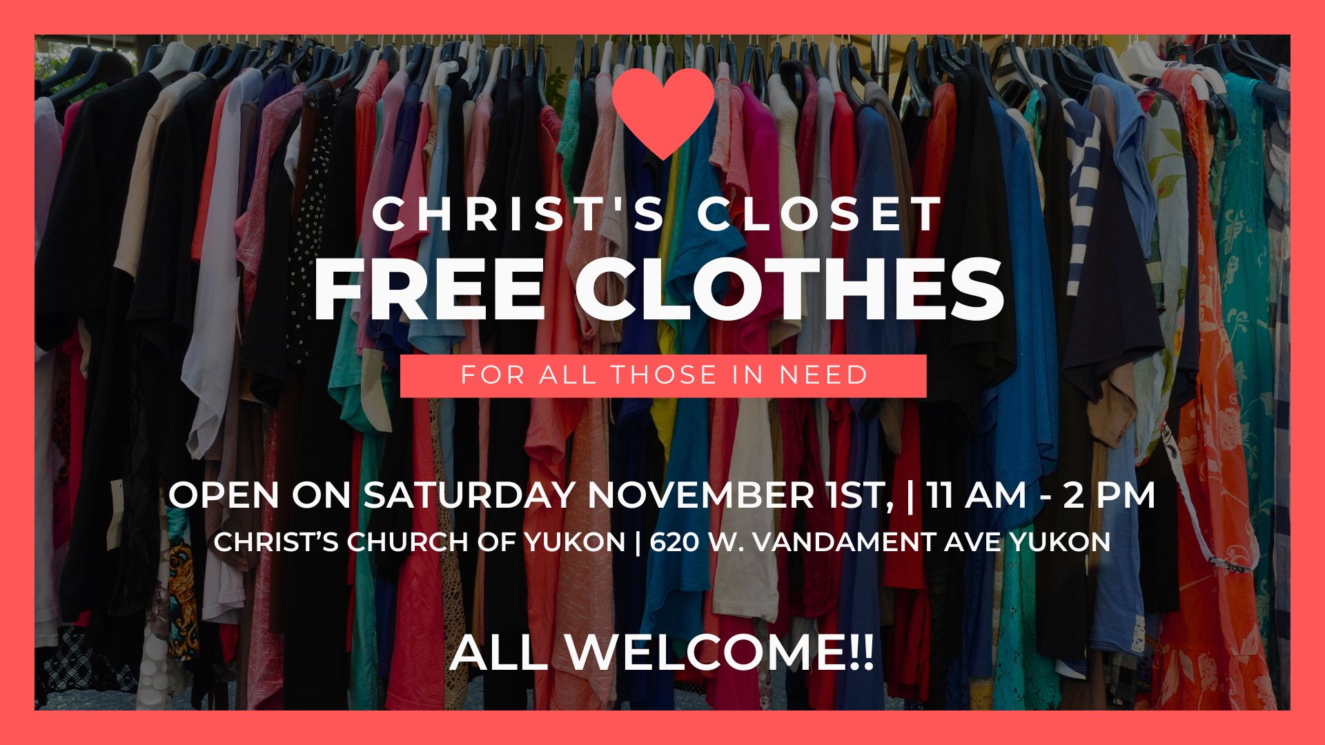 Christ's Closet | Saturday, November 1st • 11:00 AM – 2:00 PM Christ's Closet is a welcoming ministry where members of our community and surrounding areas can receive free clothing, a meal, and prayer. No income information is required — we serve with open hearts and open hands. While parents shop, children can enjoy fun crafts in a safe and caring environment, making it a family-friendly experience for everyone. Christ's Closet is open on the first Saturday of every month, so mark your calendars and help us spread the word! We look forward to serving you and sharing in God's love through service. ❤️