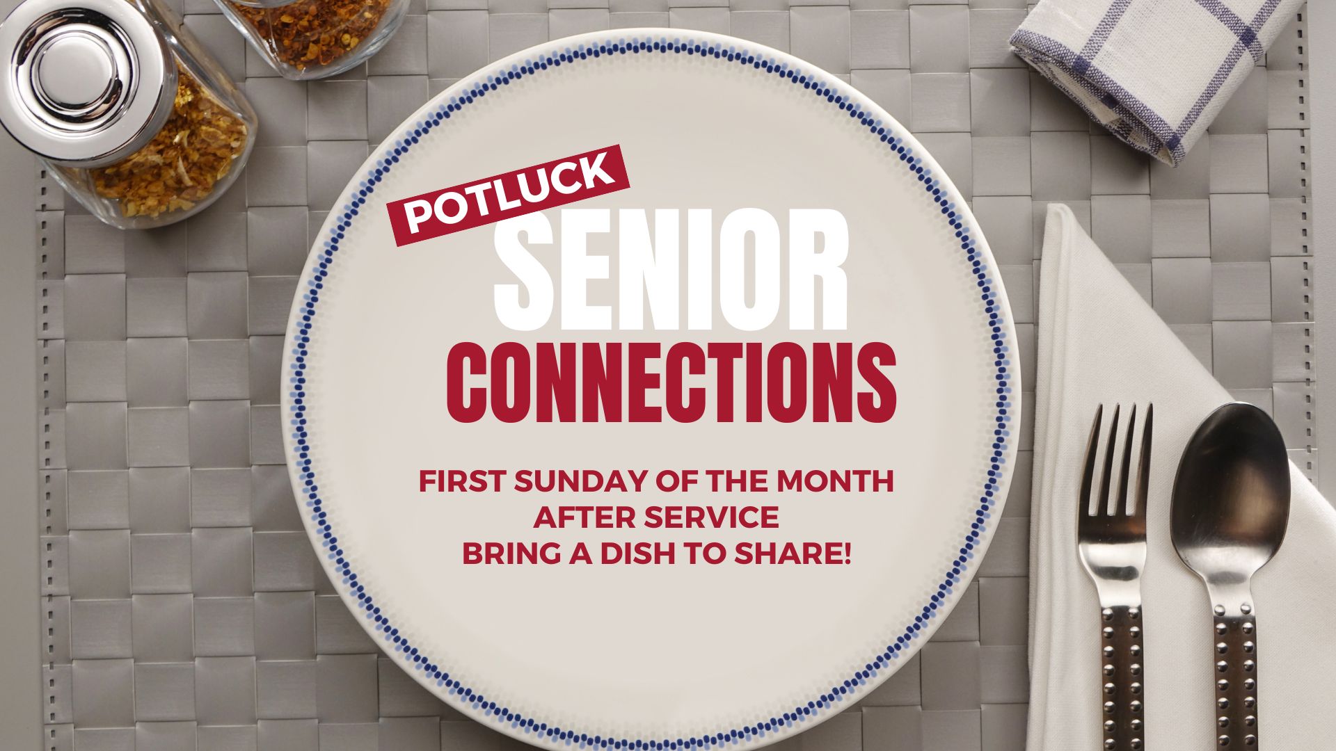 Senior Connections Potluck | First Sunday of the month after service. Hi Seniors! Just a quick reminder that our Senior Connections Potluck is coming up next Sunday, January 4th, right after service. All seniors are invited to bring a dish to share and enjoy some good food and great fellowship. During our time together, Kathy Stanka will be leading a useful discussion. Bring a friend and your favorite potluck dish—we'll see you there!